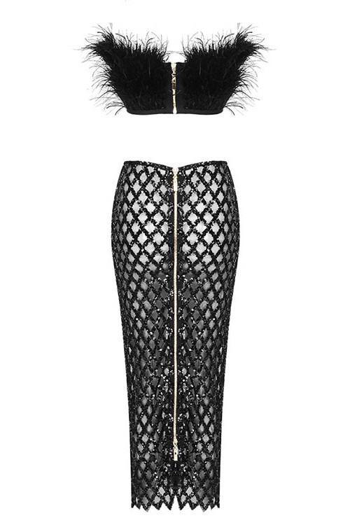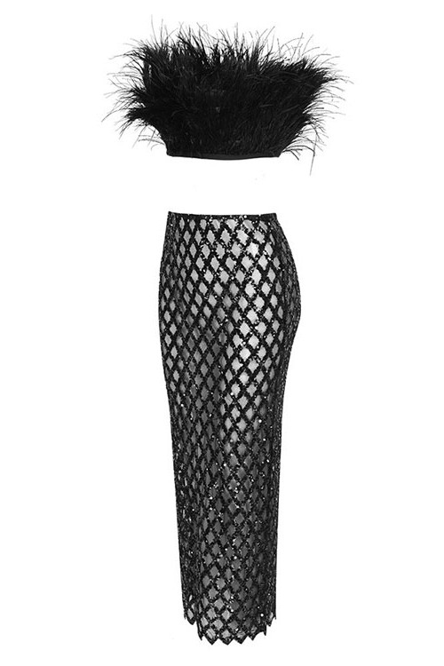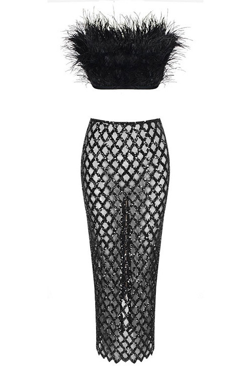 Strapless Feather Maxi Two Piece Dress Black