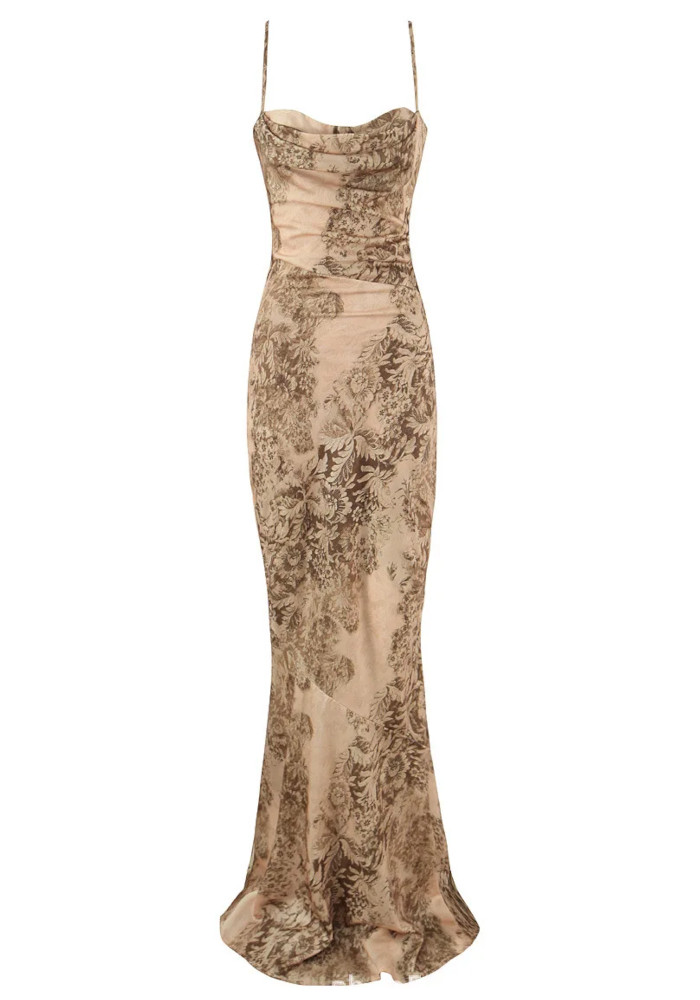 Floral Print Draped Maxi Dress Khaki
