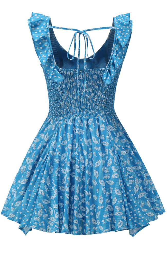 Floral Ruffle Detail A Line Dress Blue