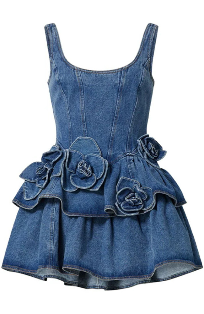 Floral Ruffle Detail Denim Dress Blue