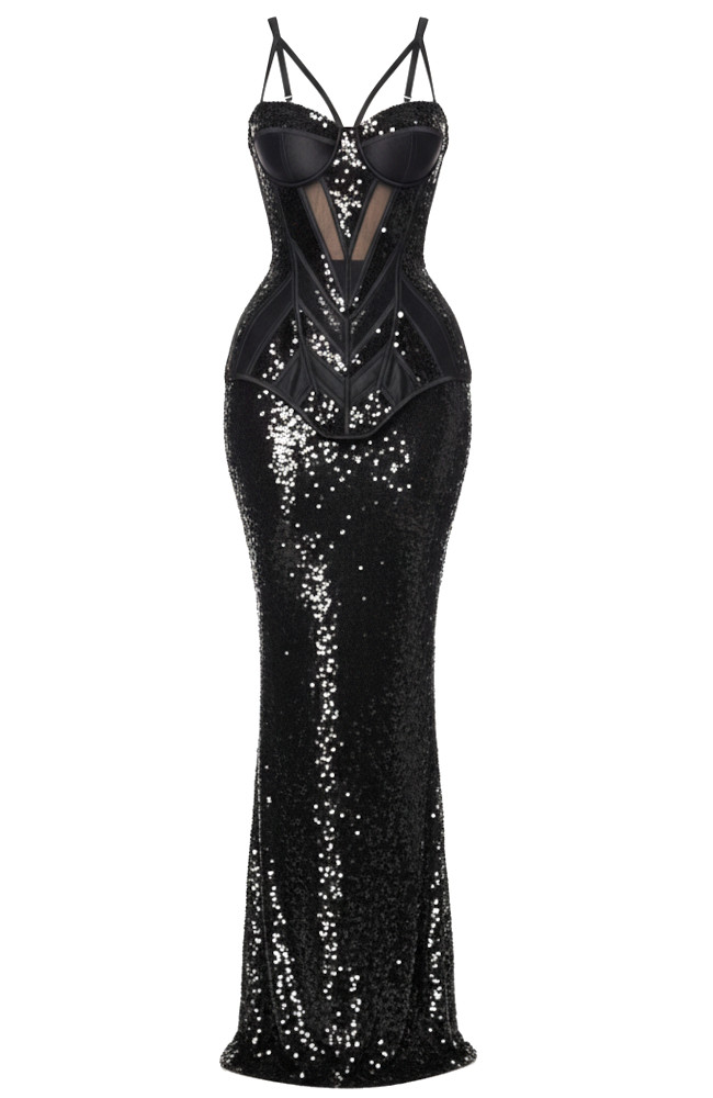 Floral Sequin Bustier Maxi Dress Black