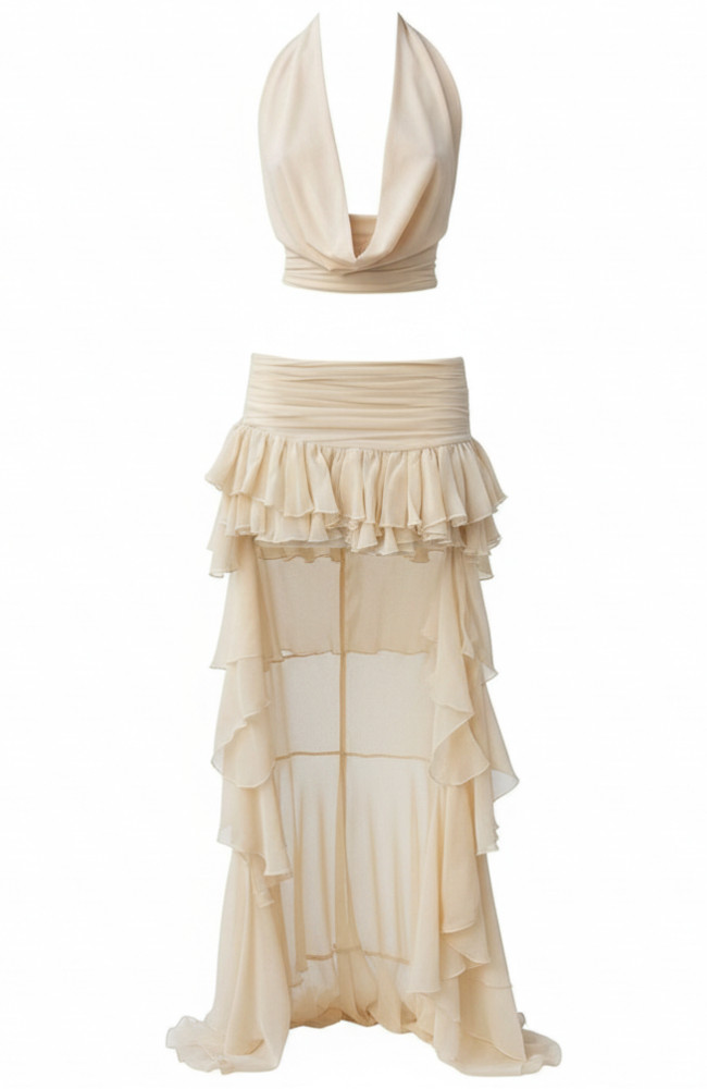 Halter Draped Ruffle Two Piece Maxi Dress Ivory