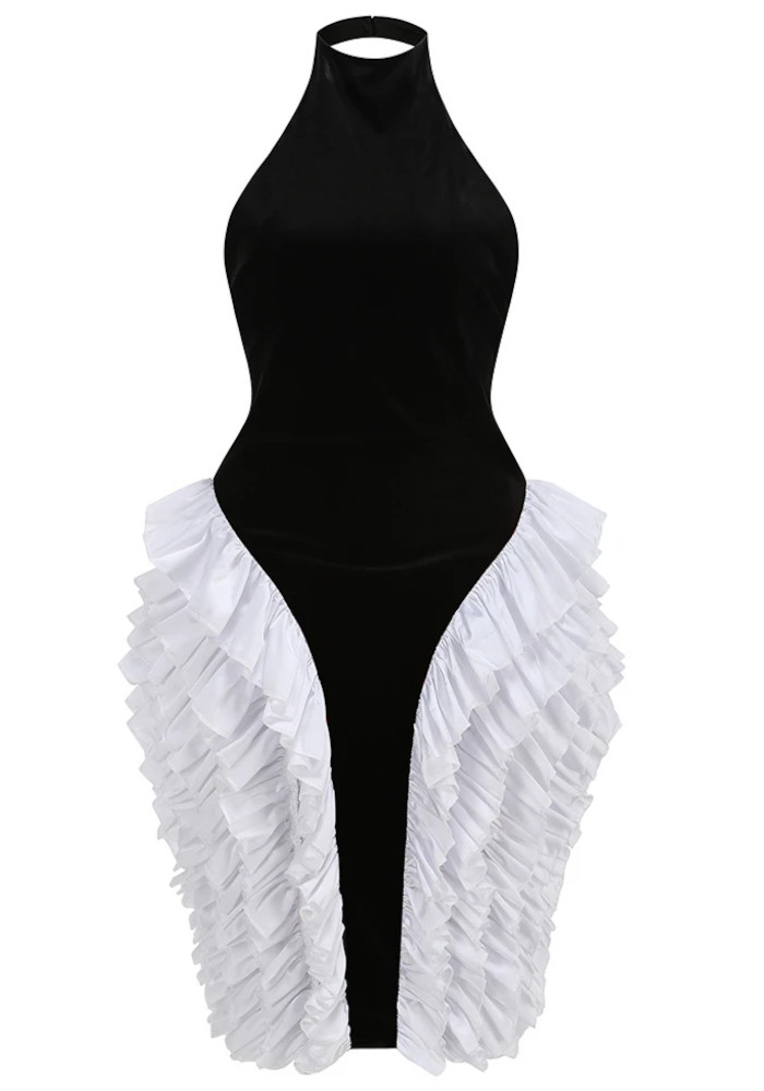 Halter Ruffle Velvet Midi Dress Black White