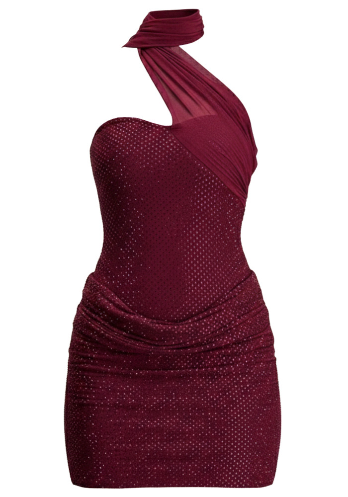 Halter Scarf Draped Sparkly Dress Burgundy