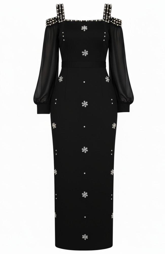 Long Sleeve Crystal Cold Shoulder Maxi Dress Black
