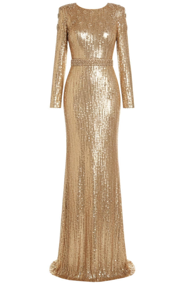 Long Sleeve Crystal Detail Sequin Maxi Dress Gold