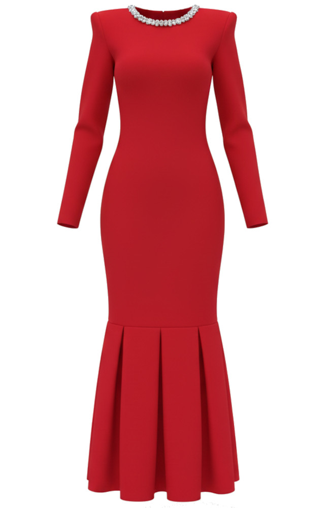 Long Sleeve Crystal Neck Fluted Midi Dress Red