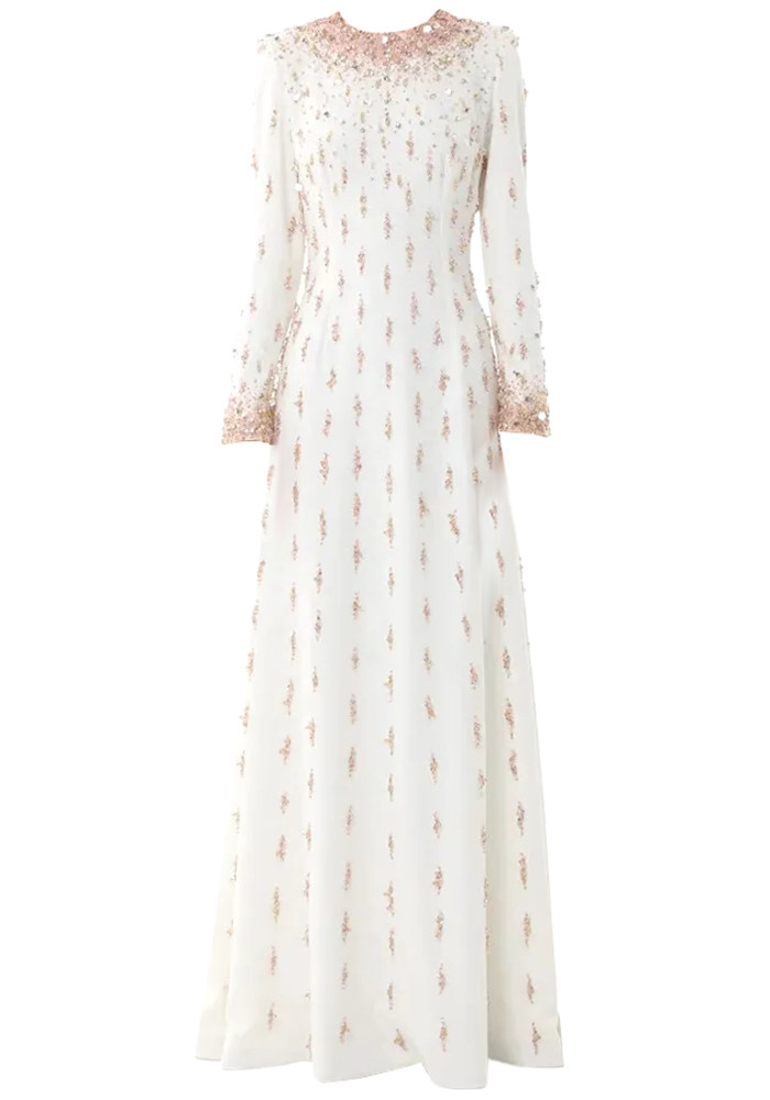 Long Sleeve Crystal Pearl Sequin Maxi Dress White