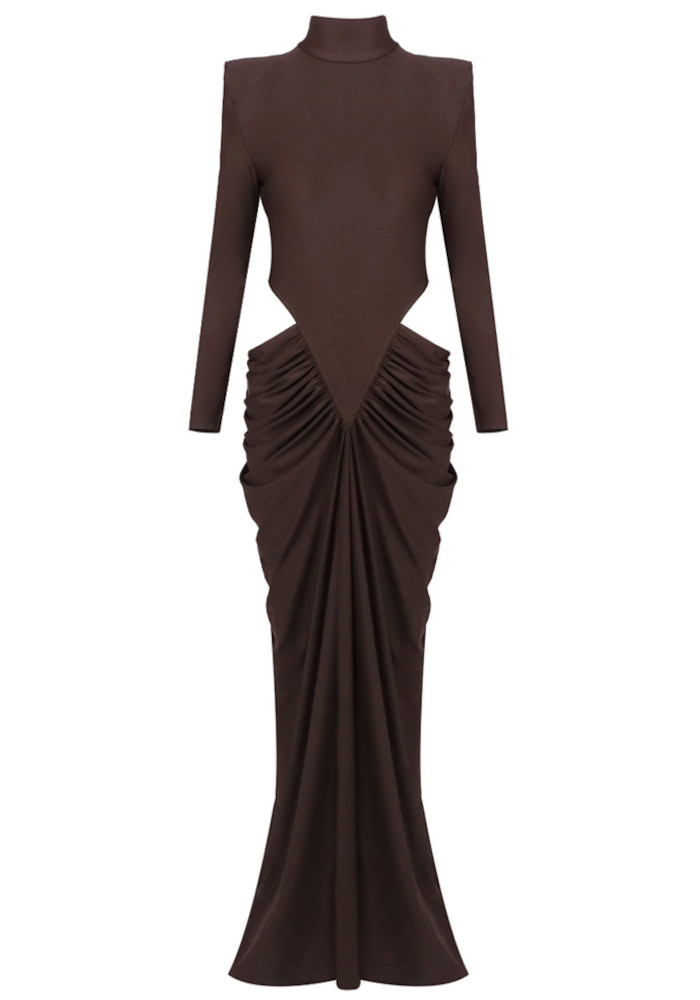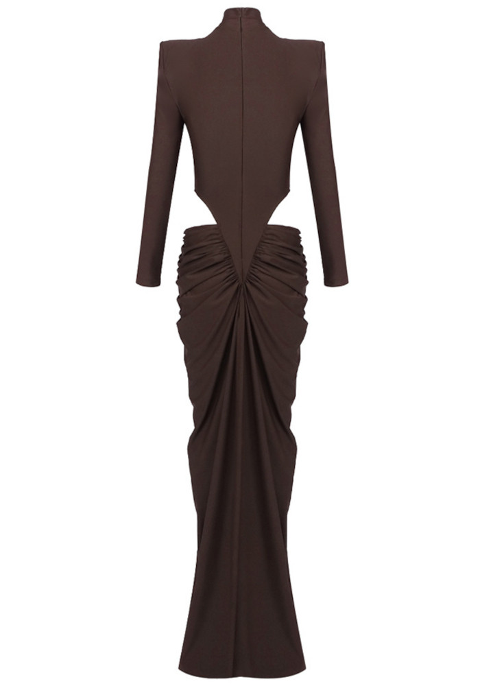 Long Sleeve Cut Out Draped Maxi Dress Brown