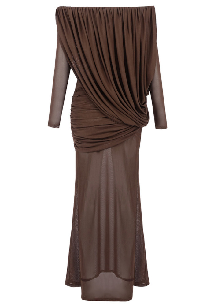 Long Sleeve Draped Bardot Maxi Dress Brown