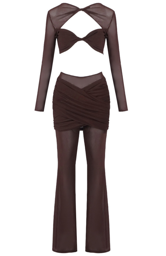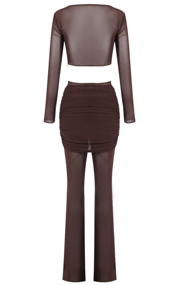 Long Sleeve Mesh Insert Two Piece Jumpsuit Brown