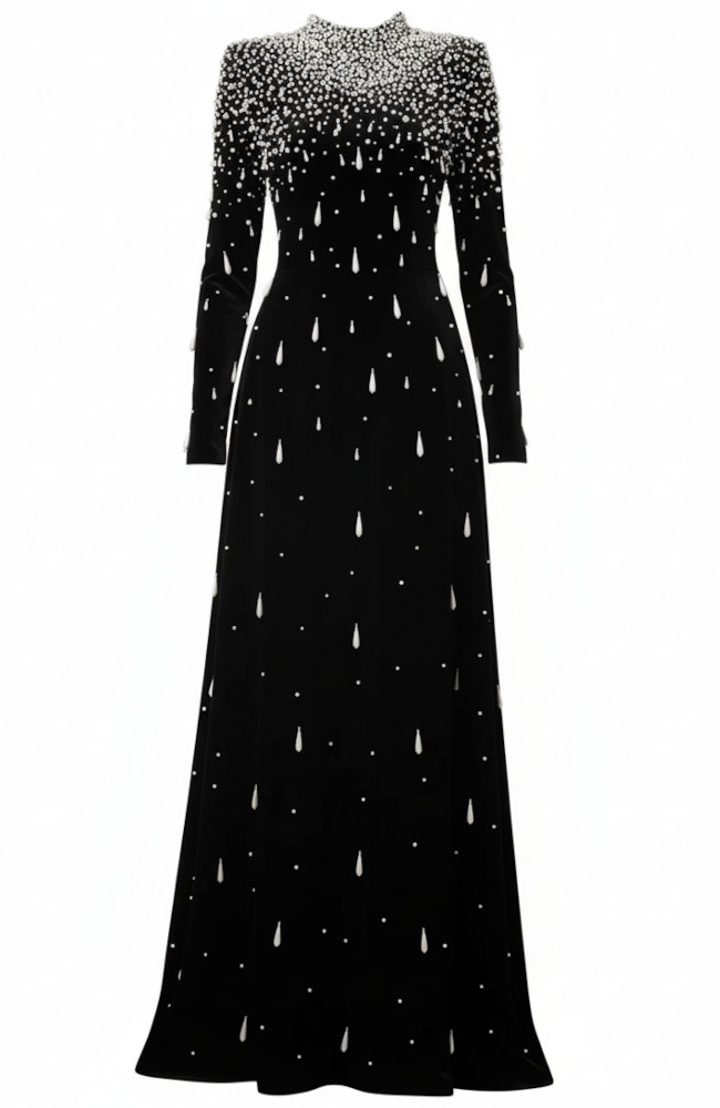 Long Sleeve Pearl Maxi Velvet Dress Black