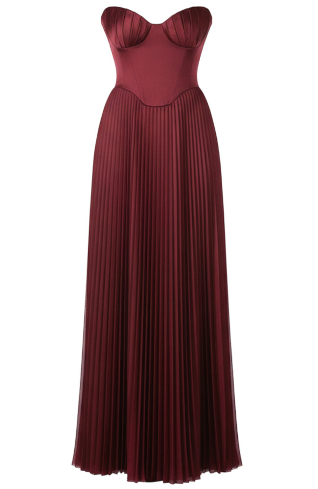 Strapless Bustier Pleated A Line Maxi Dress Burgundy