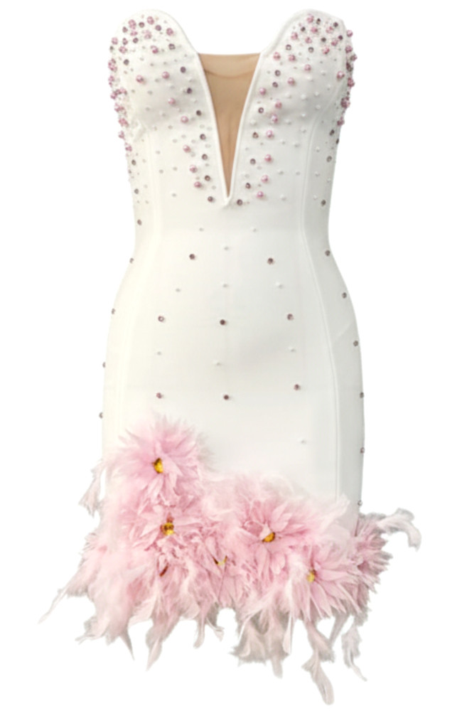 Strapless Crystal Floral Feather Hem Dress White Pink