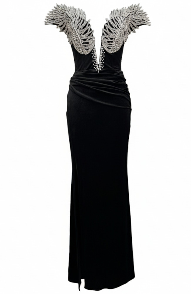 Strapless Crystal Wings Maxi Velvet Dress Black