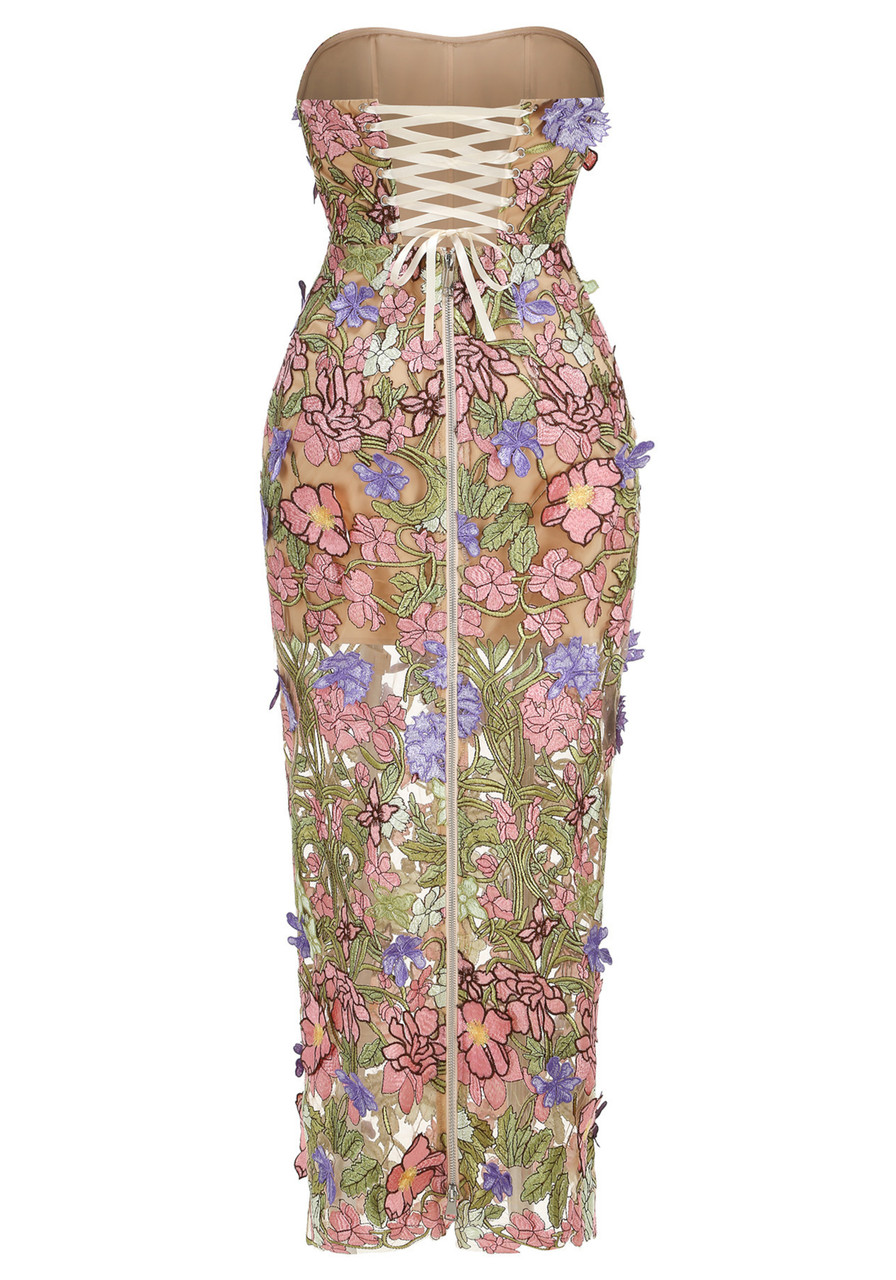 Strapless Floral Corset Maxi Dress Pink Green