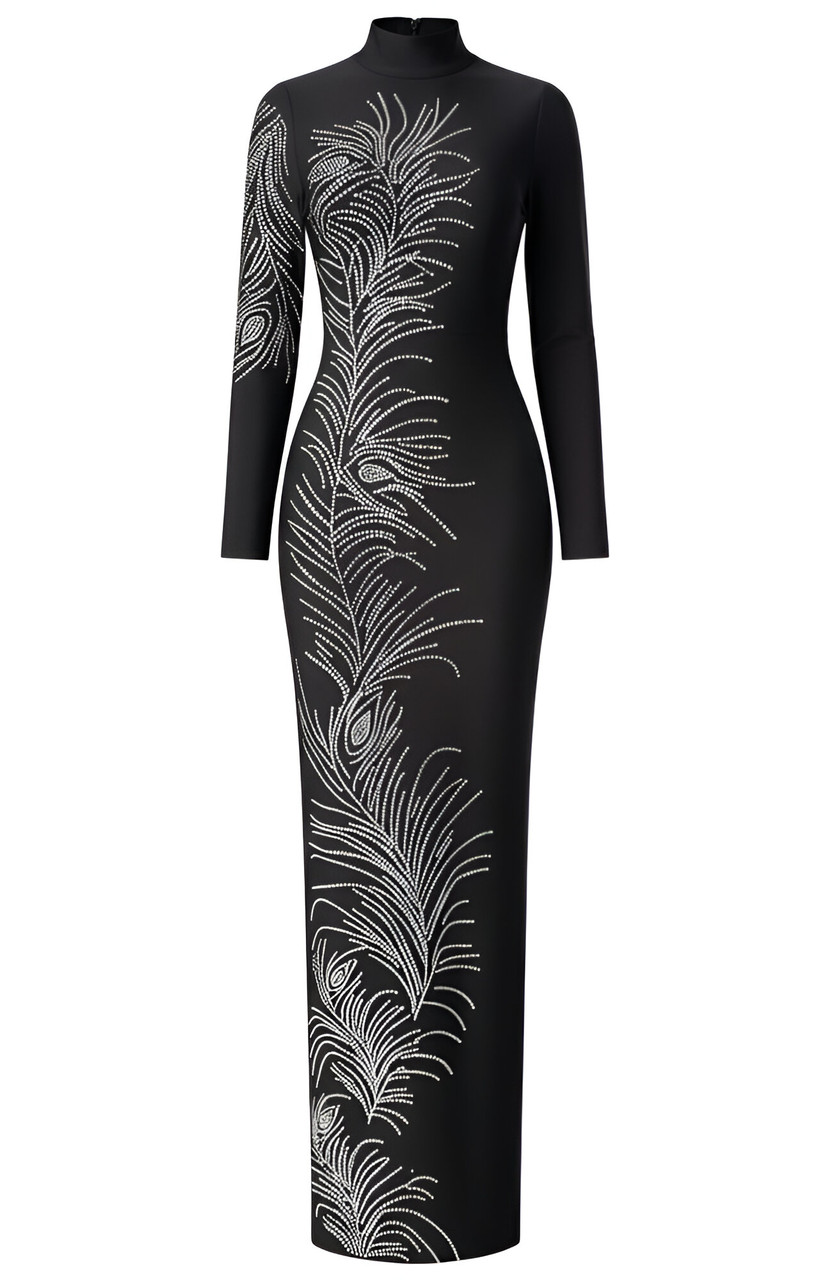 Long Sleeve Crystal Peacock Feathers Maxi Dress Black