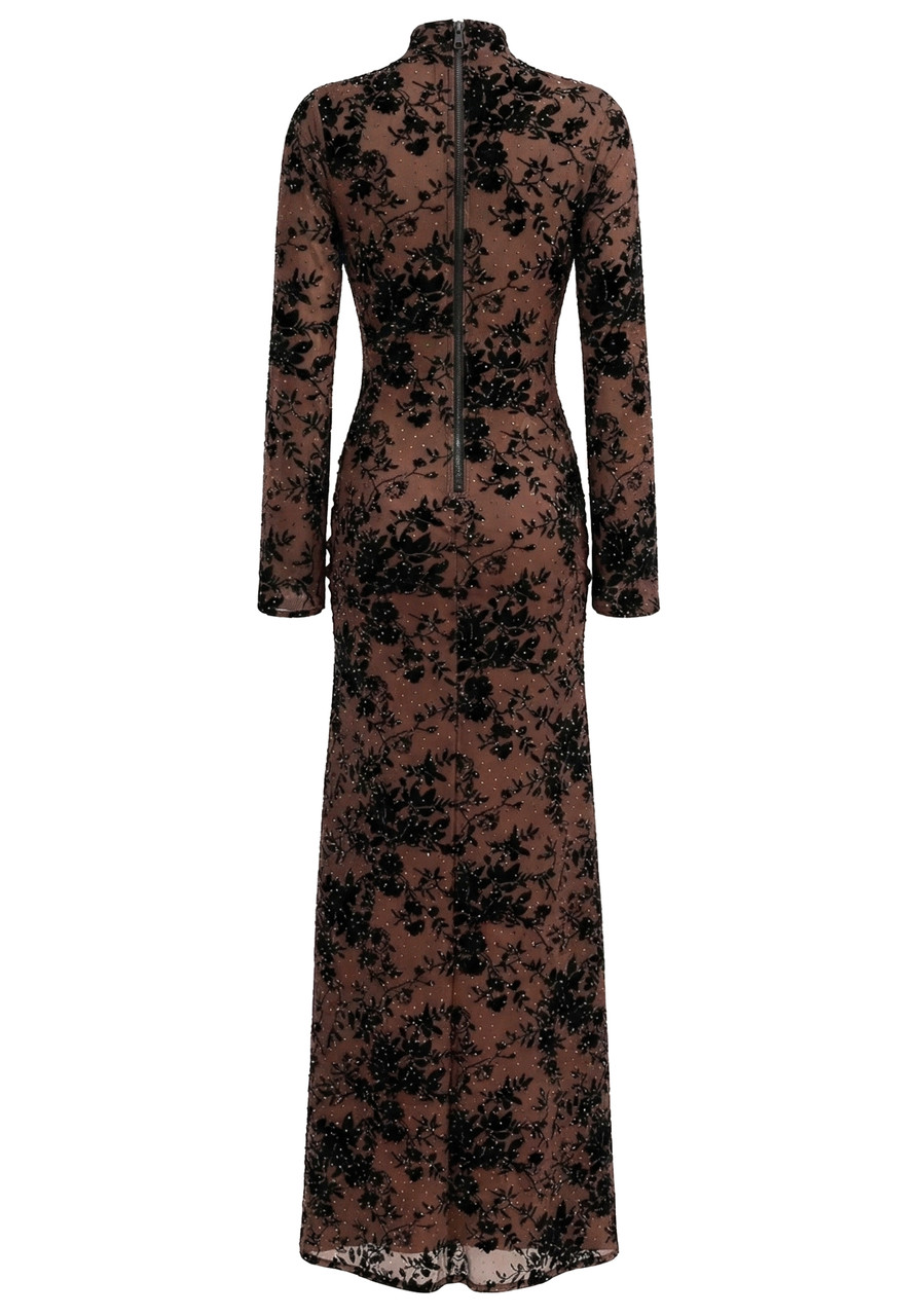 Long Sleeve Embellished Lace Maxi Dress Brown