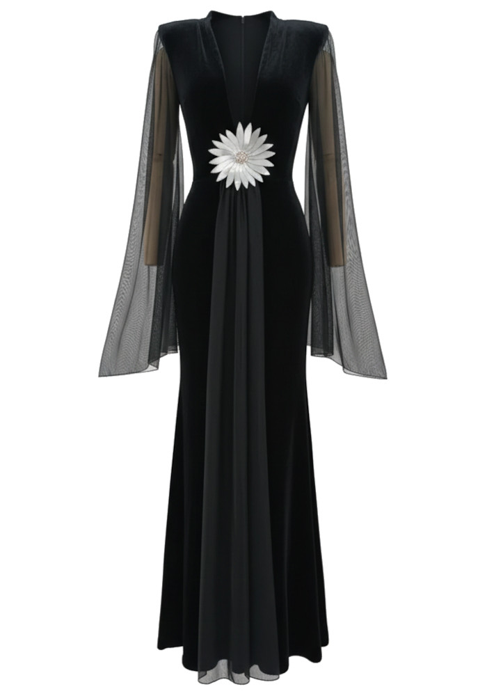 Mesh Sleeves Floral Maxi Velvet Dress Black