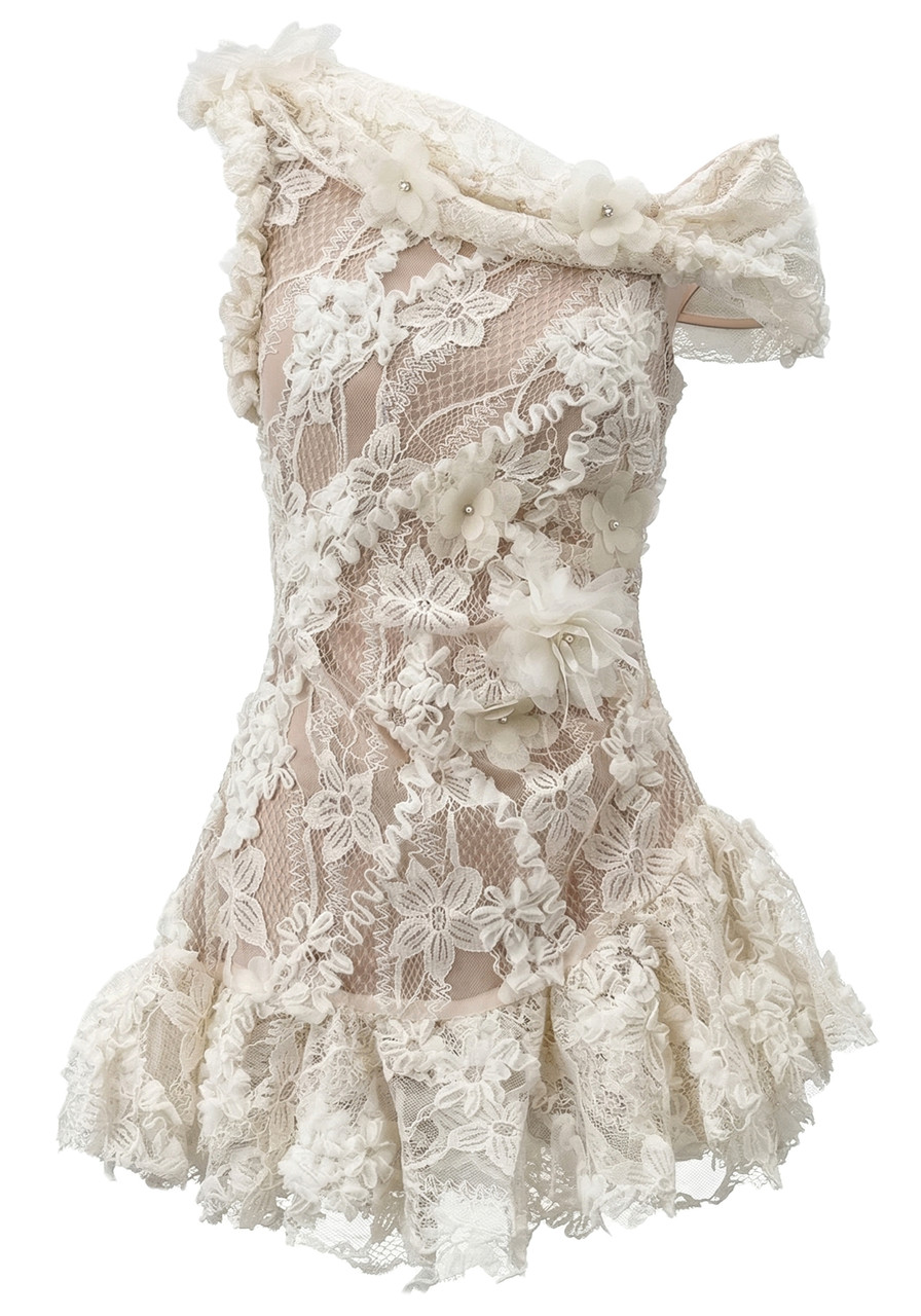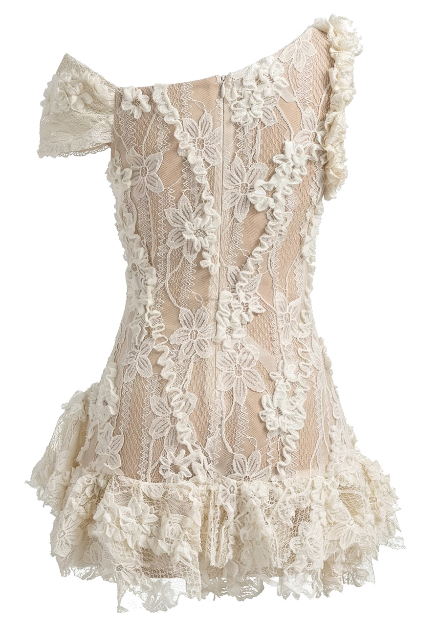 One Shoulder Bardot Floral Lace Dress Ivory