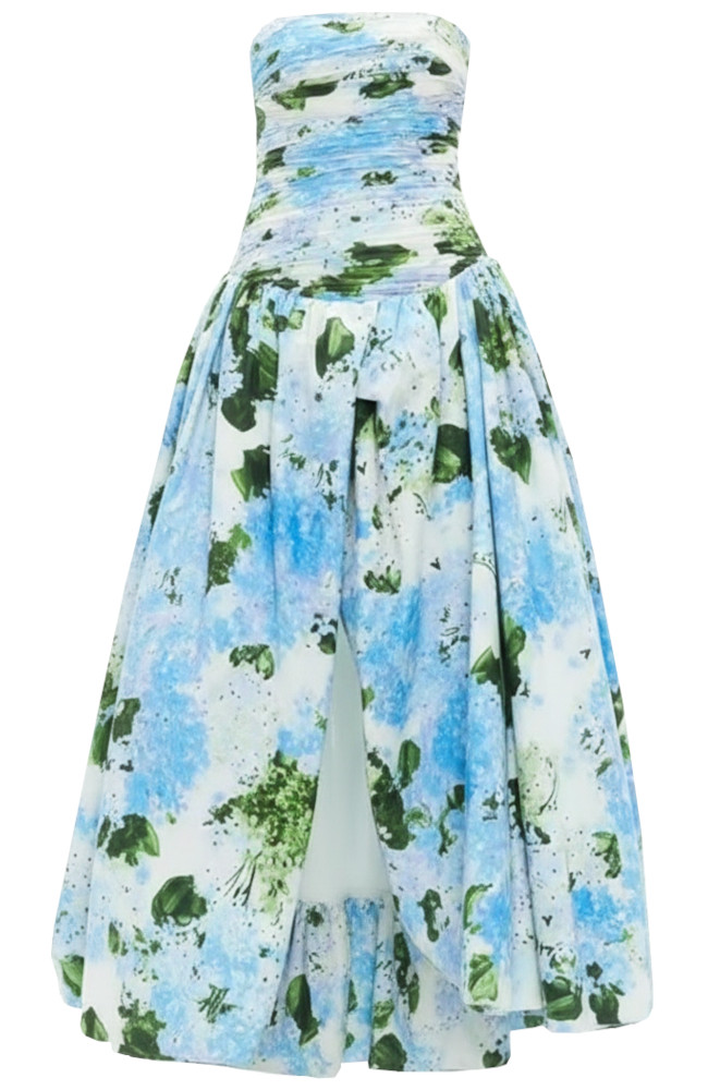 Strapless Ruched Floral Puff Maxi Dress Blue Green